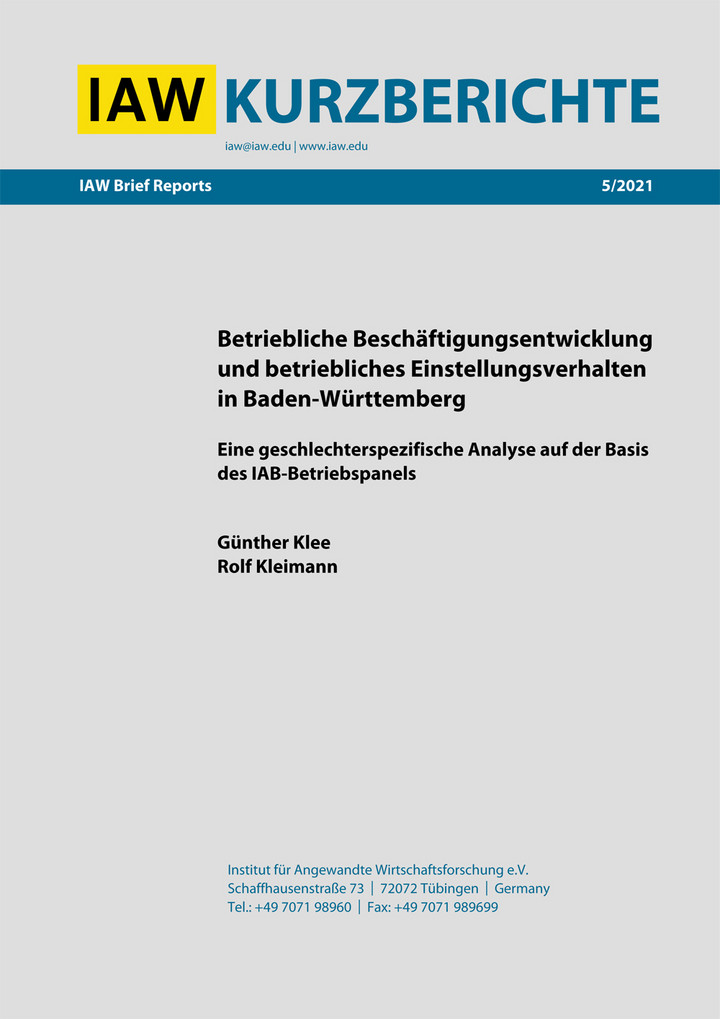 Das Institut für Angewandte Wirtschaftsforschung Tübingen (IAW) hat im Auftrag des Wirtschaftsministeriums Baden-Württemberg 2021 eine Sonderauswertung zum Thema „Betriebliche Beschäftigungsentwicklung und betriebliches Einstellungsverhalten in Baden‐Württemberg. Eine geschlechtsspezifi-sche Analyse auf der Basis des IAB‐Betriebspanels“ durchgeführt.