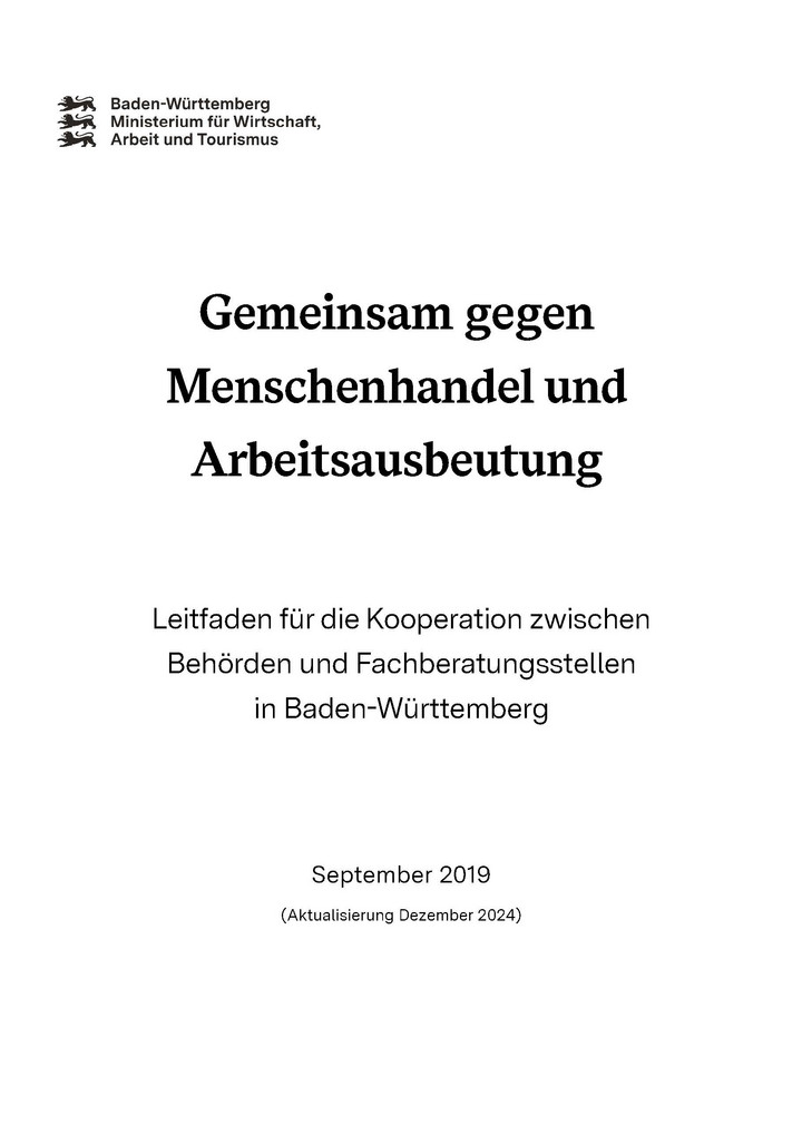 Der Leitfaden „Gemeinsam gegen Menschenhandel und Arbeitsausbeutung“ für die Kooperation zwischen Behörden und Fachberatungsstellen in Baden-Württemberg wurde vom Runden Tisch „Menschenhandel“ erarbeitet. Er zeigt die Vorgehensweisen für eine koordinierte Zusammenarbeit der Akteure auf Landesebene mit den lokalen und regionalen Akteuren auf.