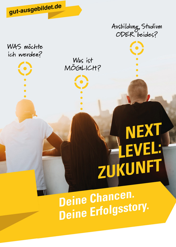 Der Flyer „Next Level: Zukunft“ des Ausbildungsbündnisses Baden-Württemberg informiert Schülerinnen und Schüler über die zentralen Angebote zur beruflichen Orientierung und Ausbildungsvermittlung.