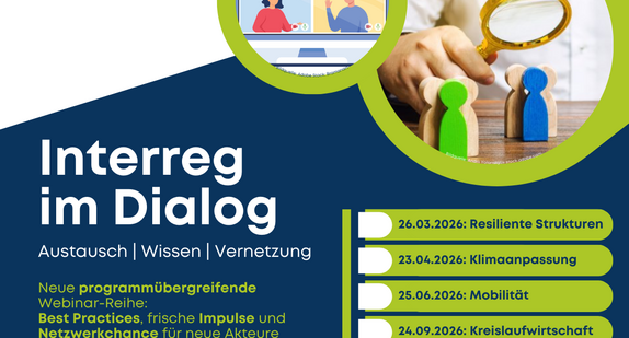 Mit der neuen Webinar-Reihe „Interreg im Dialog – Austausch | Wissen | Vernetzung“ unterstützen die deutschen Interreg-B-Kontaktstellen gemeinsam mit dem Bundesinstitut für Bau-, Stadt- und Raumforschung (BBSR) den programmübergreifenden Austausch zwischen deutschen Projektakteuren und weiteren Stakeholdern aller Bundesländer.